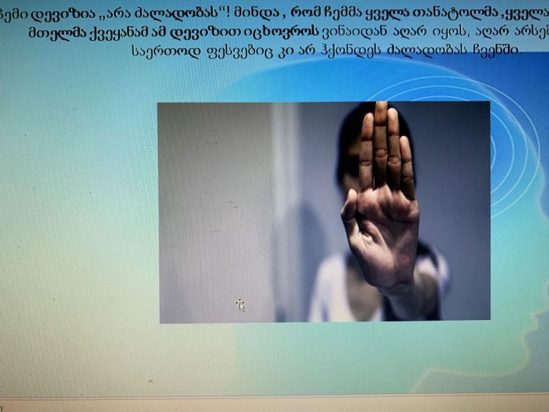 პრეზენტაცია მე-12 კლასის მოსწავლეების წინაშე კლასის ხელმძღვანელმა გიული ბერიძემ წარადგინა. იმსჯელეს ძალადობის სახეებსა და ცნობიერების ამაღლების მნიშვნელობაზე.